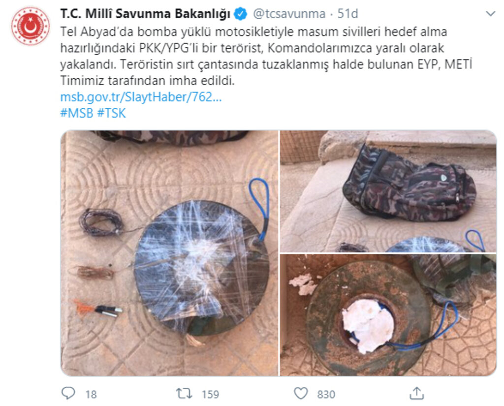 Milli Savunma Bakanlığı tarafından yapılan açıklamada "Tel Abyad’da bomba yüklü motosikletiyle masum sivilleri hedef alma hazırlığındaki PKK/YPG’li bir terörist, Komandolarımızca yaralı olarak yakalandı. Teröristin sırt çantasında tuzaklanmış halde bulunan EYP, METİ Timimiz tarafından imha edildi." denildi.