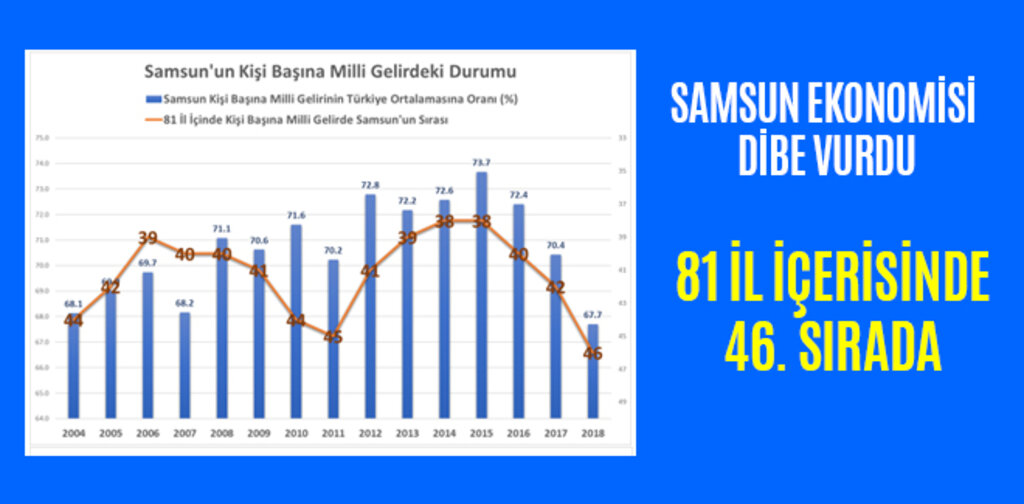 Samsun ekonomisi tarihi dip seviyede! Türkiye'de kişi başına ortalama gelir 100'se Samsun'da 67,7. Samsun, Türkiye ortalamasının %32,3 altında! Samsun bunu haketmiyor! Kişi başına gelirde Samsun, 81 il içinde 46. sıraya geriledi! Son 3 yılda 8 basamak birden geriledi!