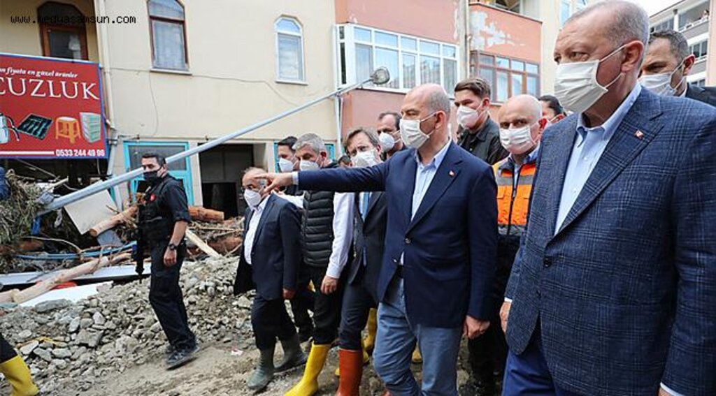 Salı günü başlayan yoğun yağışların, Kastamonu, Bartın, Sinop illerinde büyük sel felaketlerine neden olduğunu belirten Cumhurbaşkanı Erdoğan, Kastamonu'da Bozkurt, Azdavay, İnebolu, Küre ve Pınarbaşı ilçelerinin bu yağışlardan en çok etkilenen yerler olduğunu söyledi.Bartın'ın Ulus, Sinop'un Ayancık ilçelerinin kimi köylerinin de selden ciddi şekilde etkilendiğine işaret eden Cumhurbaşkanı Erdoğan, "geçmiş olsun" dileklerini iletti.Selde hayatını kaybedenlere Allah'tan rahmet, yakınlarına ve Türk milletine başsağlığı dileğinde bulunan Cumhurbaşkanı Erdoğan, "Bartın'da kaybolan vatandaşımızı arama çalışmalarımız sürüyor. Yaralanan vatandaşlarımızdan ilk müdahaleleri tamamlananlar taburcu edilirken, az sayıda vatandaşımızın tedavisi hâlen devam ediyor. Rabb'imden kendilerine şifalar diliyorum" dedi.