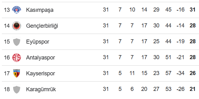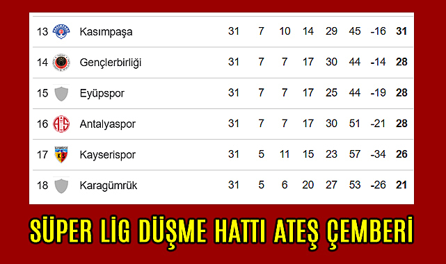 Süper Lig'de bitime 3 hafta kala kümede kalma mücadelesi veren takımlarda puan farkı kapanınca kıyasıya mücadele tüm hızıyla devam ediyor.Haftayı galibiyetle tamamlayan takımlardan Gençlerbirliği ve Eyüpspor puanını 28'e, Kayserispor ise 26'ya yükselirken sahadan mağlubiyetle ayrılan Alanyaspor 33, Kasımpaşa 31 ve Antalyaspor 28 puanda kaldı. Beşiktaş ile berabere kalan son sıradaki Fatih Karagümrük ise puanını 21'e çıkardı.Bu tablo, ligin son 3 haftasına girilirken alt sıralarda büyük bir rekabetin yaşanacağını gösteriyor.Süper Lig'in 32. haftasında Süper lig'de kalma mücadelesi veren takımların maç programı: 3 Mayıs Pazar:20.00 Kayserispor-Eyüpspor 20.00 Antalyaspor-Alanyaspor 20.00 Fatih Karagümrük-Gençlerbirliği 20.00 Kasımpaşa-Kocaelispor