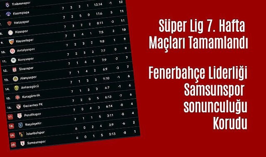 Süper Lig'de 7. hafta maçları tamamlandı. Oynanan müsabakalar şu şekilde tamamlandı.Samsunspor-Gaziantep FK: 1-2Sivasspor-Hatayspor: 0-0İstanbulspor-Antalyaspor: 1-2Trabzonspor-Pendikspor: 2-1Galatasaray-Ankaragücü: 2-1Fatih Karagümrük-Kasımpaşa: 2-3Fenerbahçe-Rizespor: 5-0Konyaspor-Beşiktaş: 0-2Adana Demirspor-Alanyaspor: 4-0Kayserispor-Başakşehir: 0-0