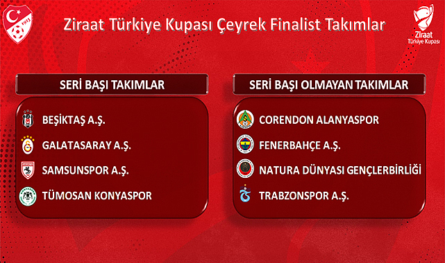 Ziraat Türkiye Kupası’nda çeyrek final karşılaşmaları tek maç eleme usulüyle oynanacak. Seri başı olan takımlar bu turda ev sahibi avantajına sahip olacak.